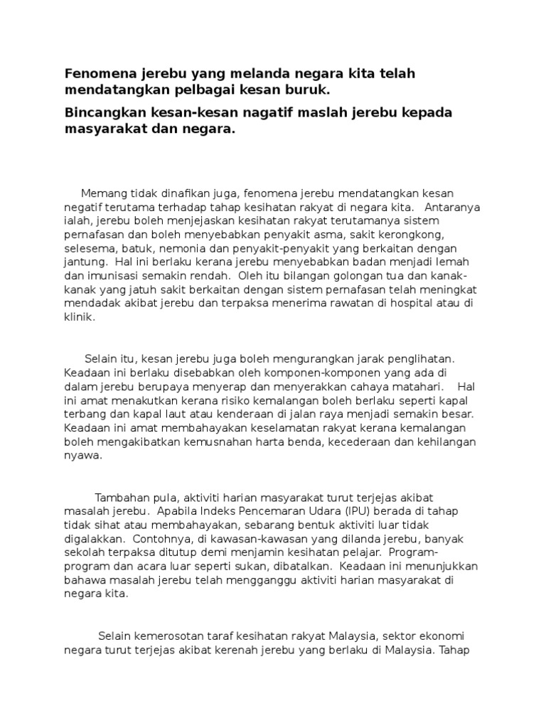 Bincangkan Kesan-Kesan Negatif Masalah Jerebu Kepada Masyarakat dan Negara Memang tidak dinafikan juga fenomena jerebu mendatangkan kesan negatif terutama terhadap tahap kesihatan rakyat di negara kita. Antaranya ialah jerebu boleh menjejaskan kesihatan rakyat terutamanya sistem pernafasan dan boleh menyebabkan penyakit asma sakit kerongkong selesema batuk. Punca Punca Jerebu Berlaku.