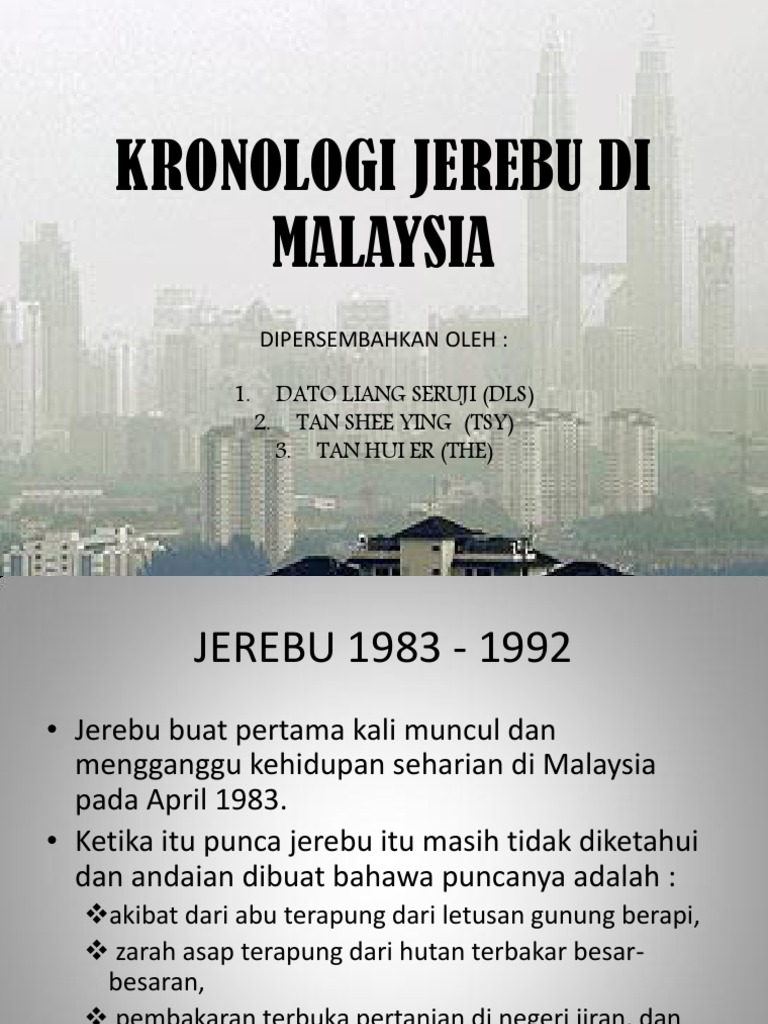 Pendahuluan Jerebu adalah satu fenomena atmosfera yang di sebabkan kewujudan banyak partikal-partikal kecil saiz mikron yang tidak boleh dilihat oleh mata kasar dan terapung di udara.